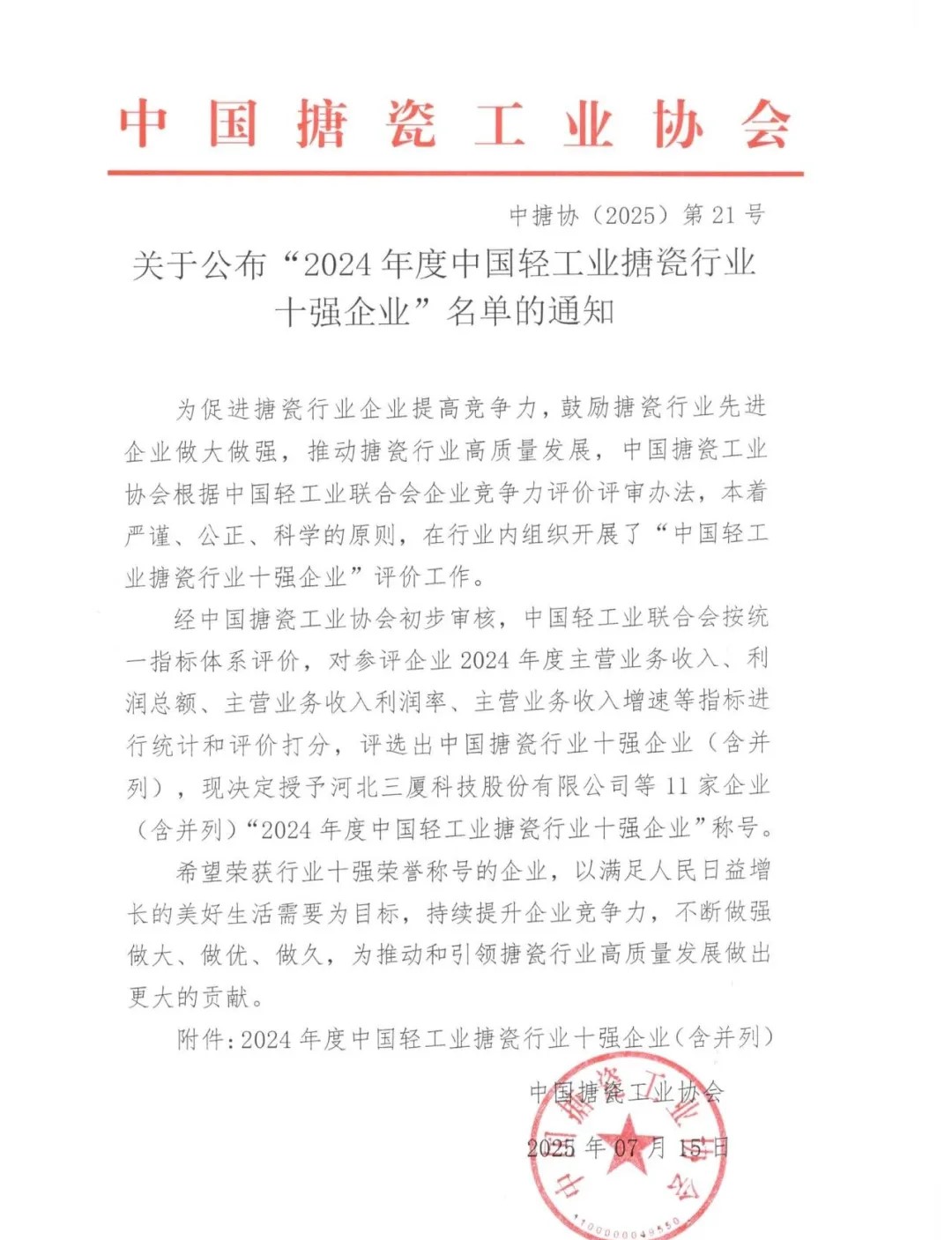 关于公布“2024年度中国轻工业搪瓷行业十强企业”名单的通知