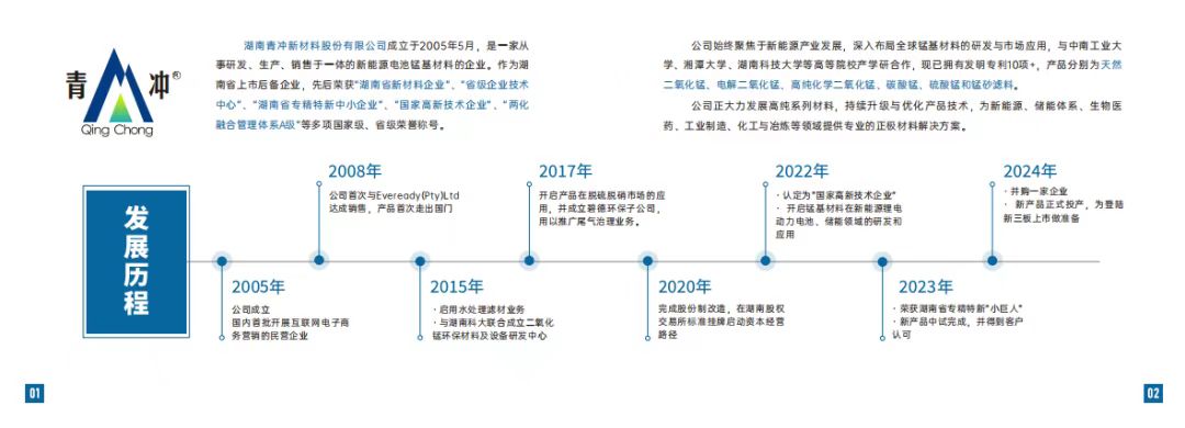 湖南青冲新材料股份有限公司成立于2005年5月,是一家从事研发、生产、销售于一体的新能源电池锰基材料的企业。作为湖 南省上市后备企业,先后荣获“湖南省新材料企业”、“省级企业技术 中心”、“湖南省专精特新中小企业”、“国家高新技术企业”、“两化 融合管理体系A级”等多项国家级、省级荣誉称号。