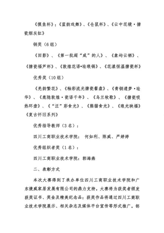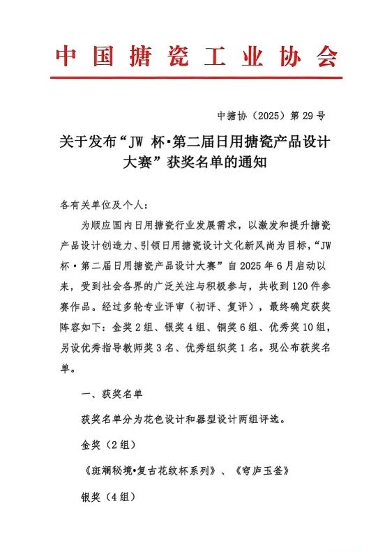 关于发布“JW 杯・第二届日用搪瓷产品设计大赛”获奖名单的通知